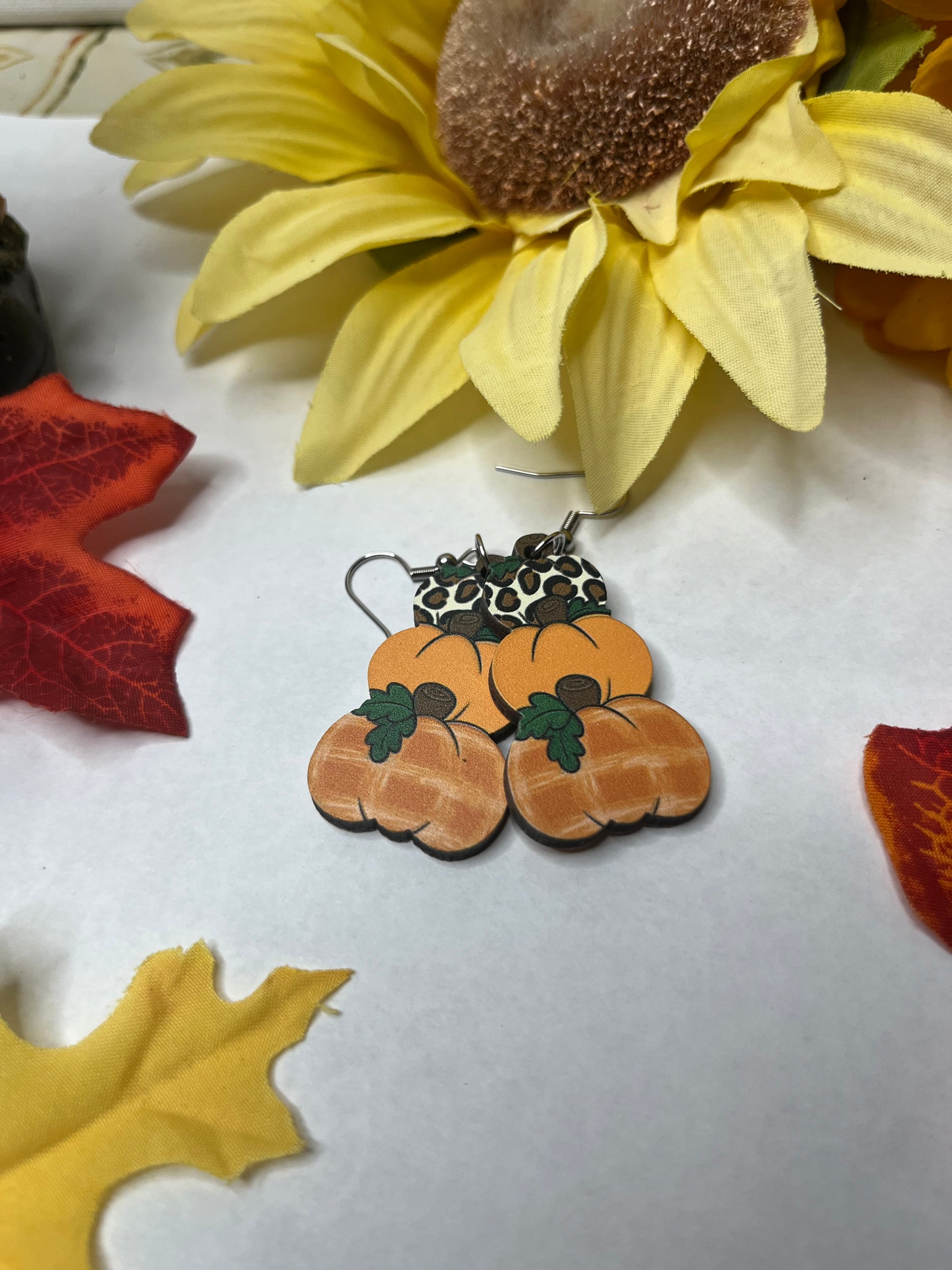 If you like leopard print and orange than you'll love these earrings. The top pumpkin is a leopard print, the second is plain orange and the third features a subtle orange plaid.