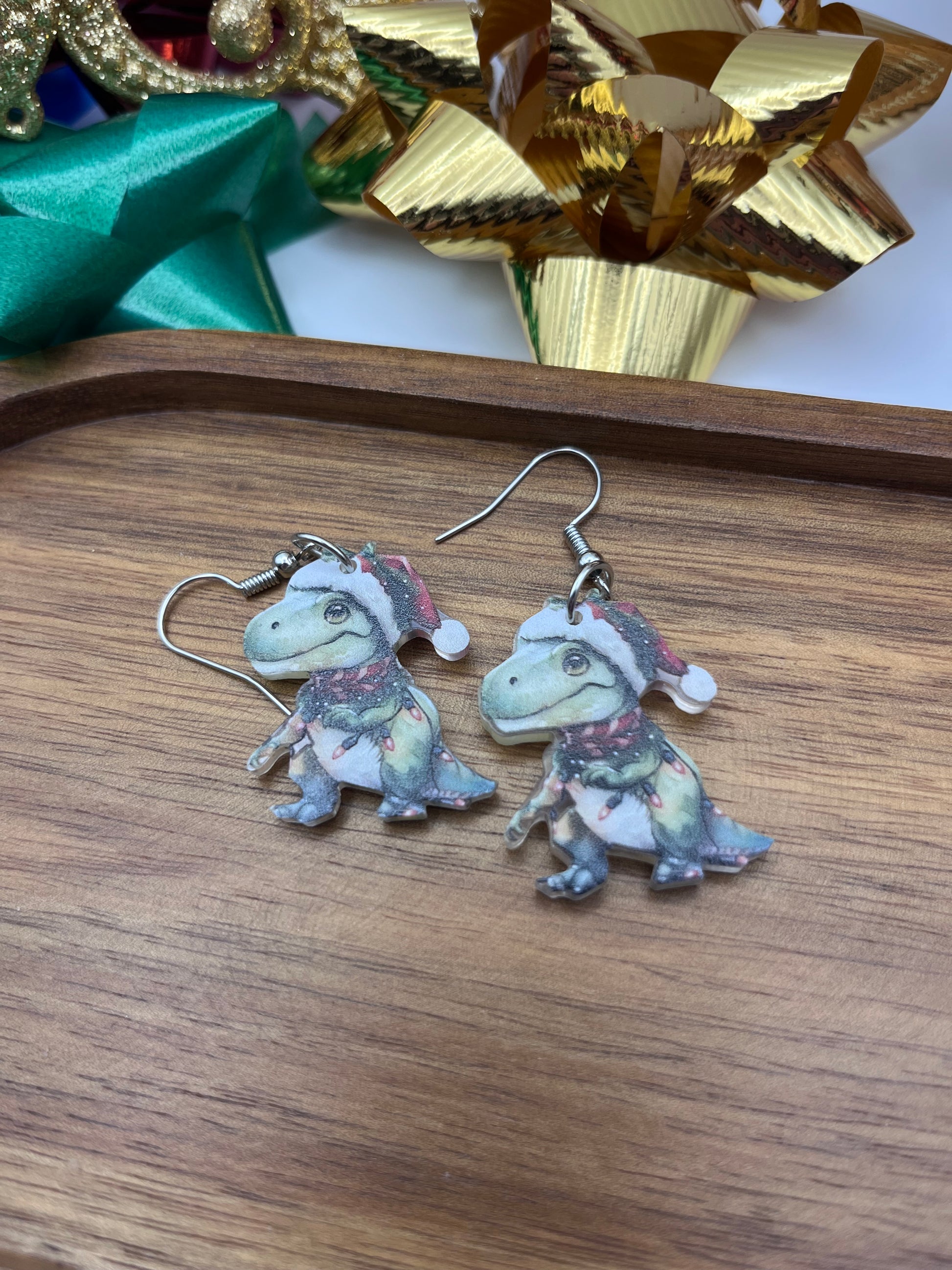 If you're feeling in a silly this Christmas, Take a look at these adorable dinosaurs. Made of plastic and metal they are a lightweight option for wearing around on the Holidays.