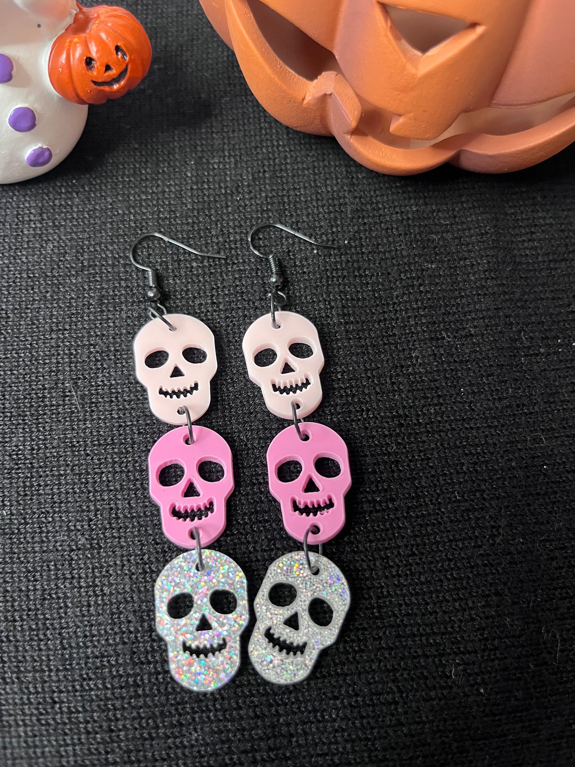 Pink, more pink, and glittery, these unique Halloween earrings will allow you to style fun new pink outfits for spooky season.